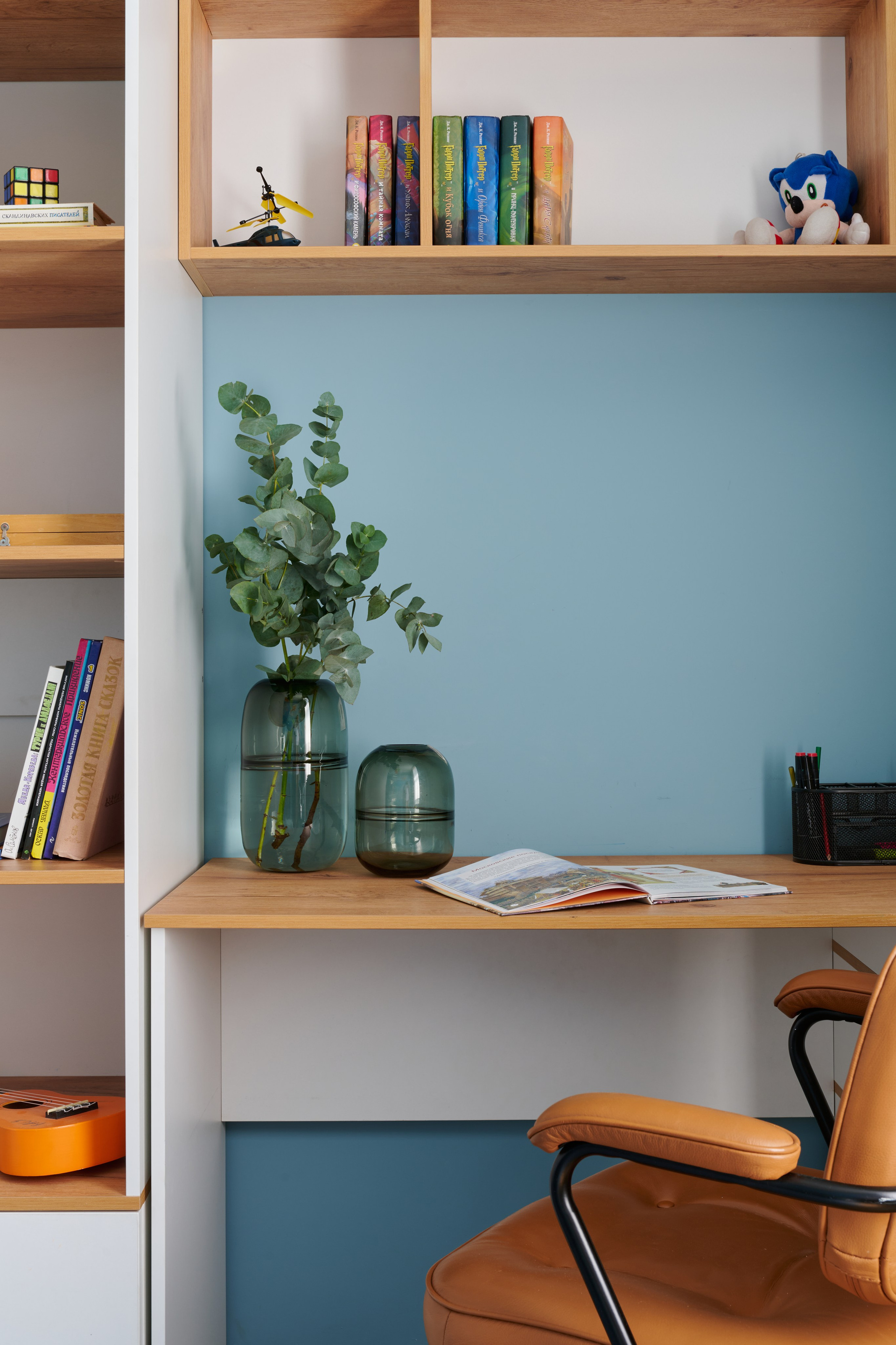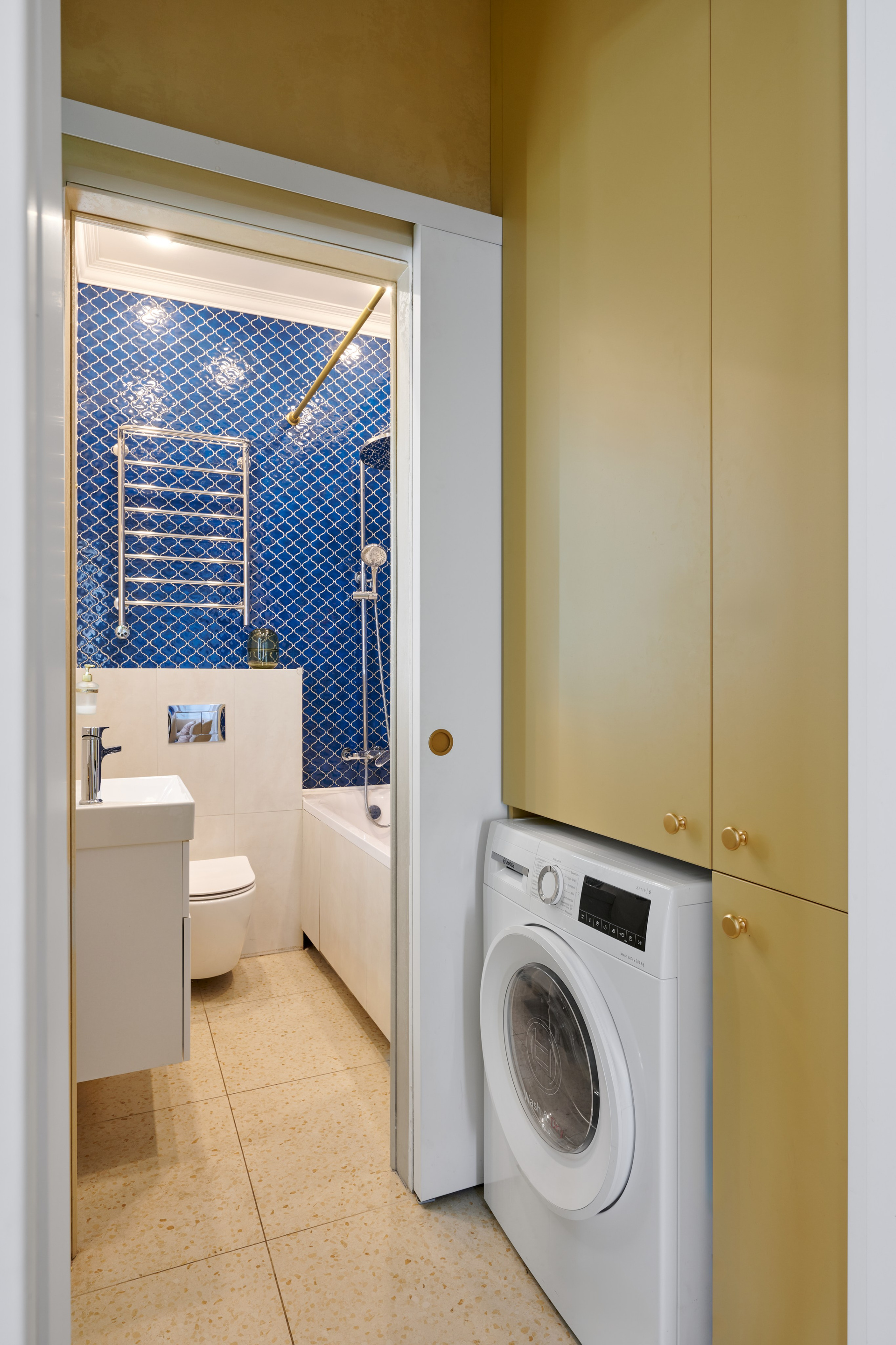 Съёмка дизайн-проекта квартиры: синий как основа и жёлтый как акцент — общие планы и детали, которые держат композицию.