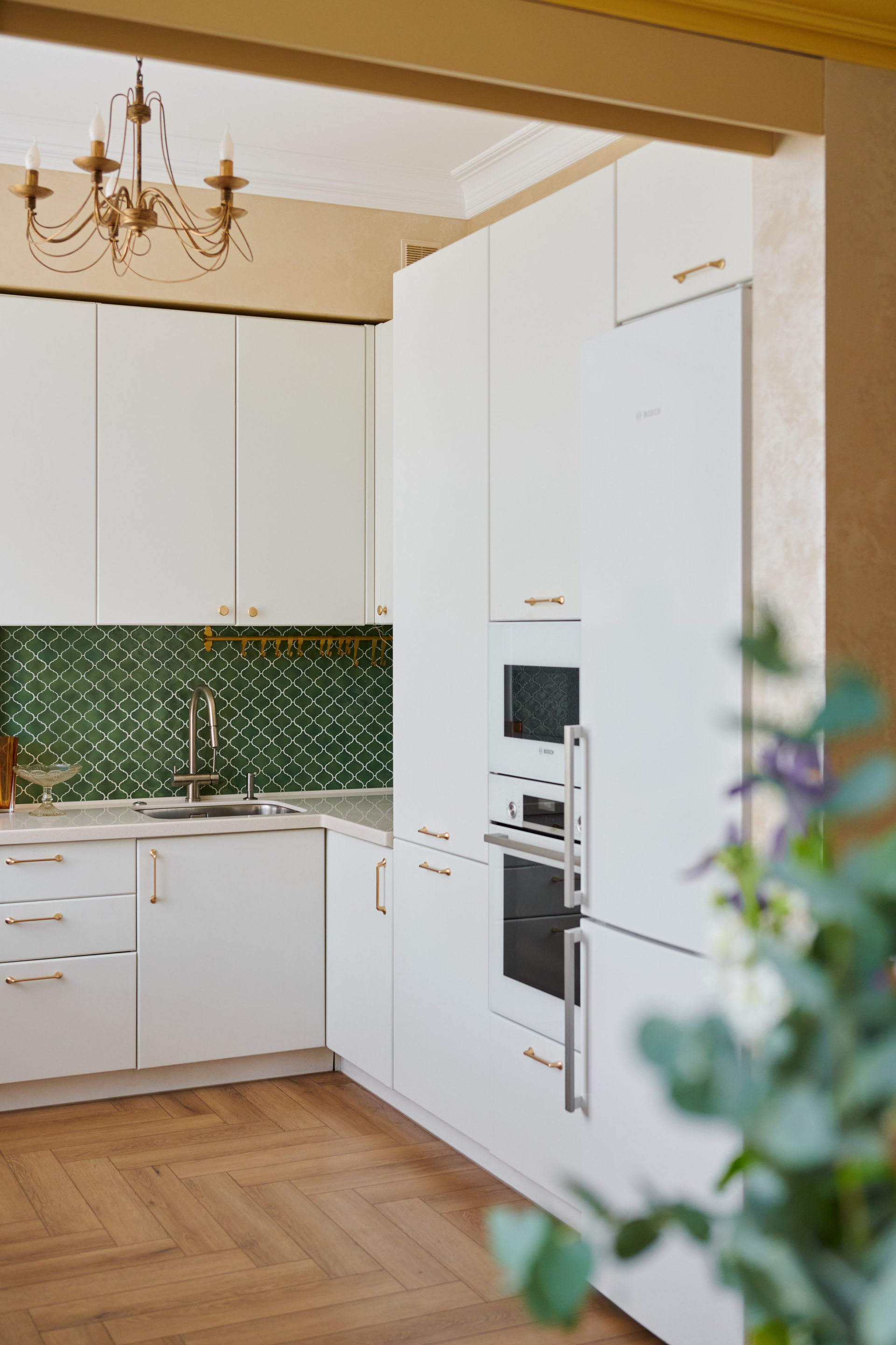 Современный интерьер: тёмная кухня и тёплые акценты