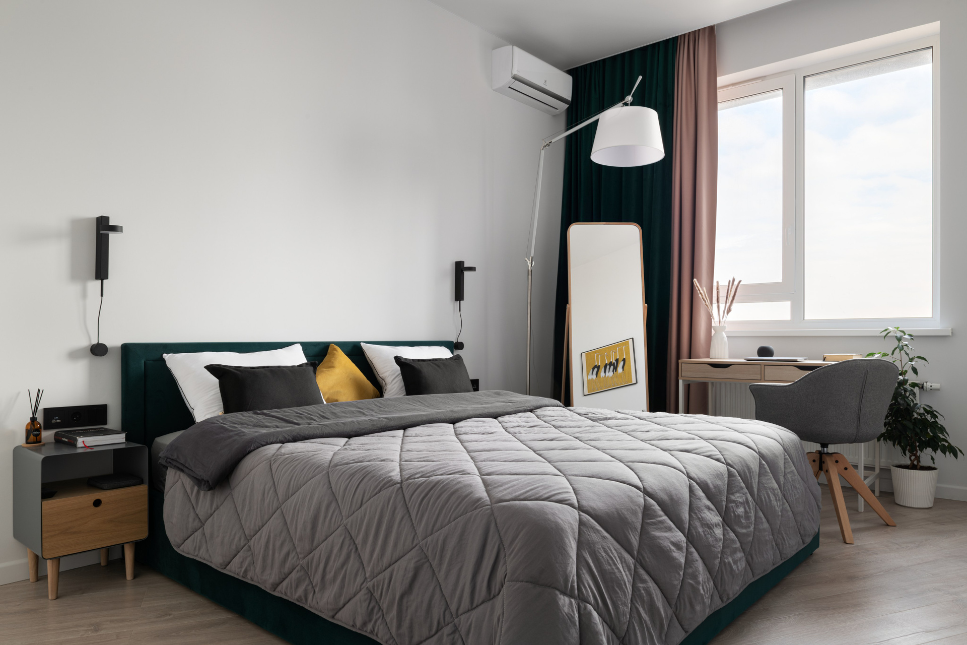 Интерьерный дизайн в серых тонах с яркими акцентами