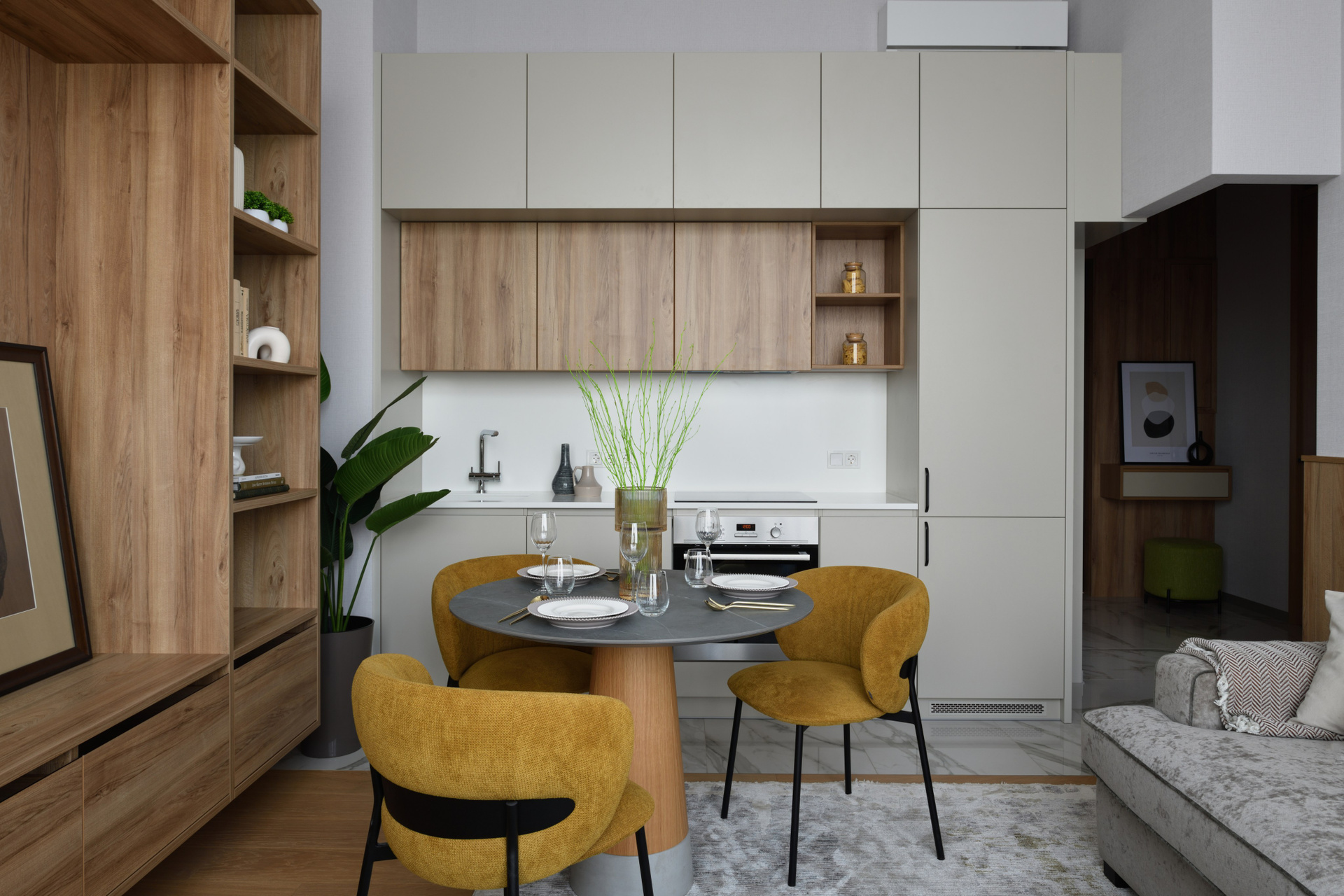 В этом интерьере всё построено на дисциплине: дерево задаёт масштаб и ритм, белые поверхности разгружают композицию, а латунные и чёрные детали дают точные акценты. Я снимал проект как систему, чтобы он одинаково убедительно работал в портфолио и публикациях: сначала читаем планировку и симметрию, потом переходим к зонам, и уже в финале закрываем «доказательства качества» — текстиль, стыки, свет, сервировку.
