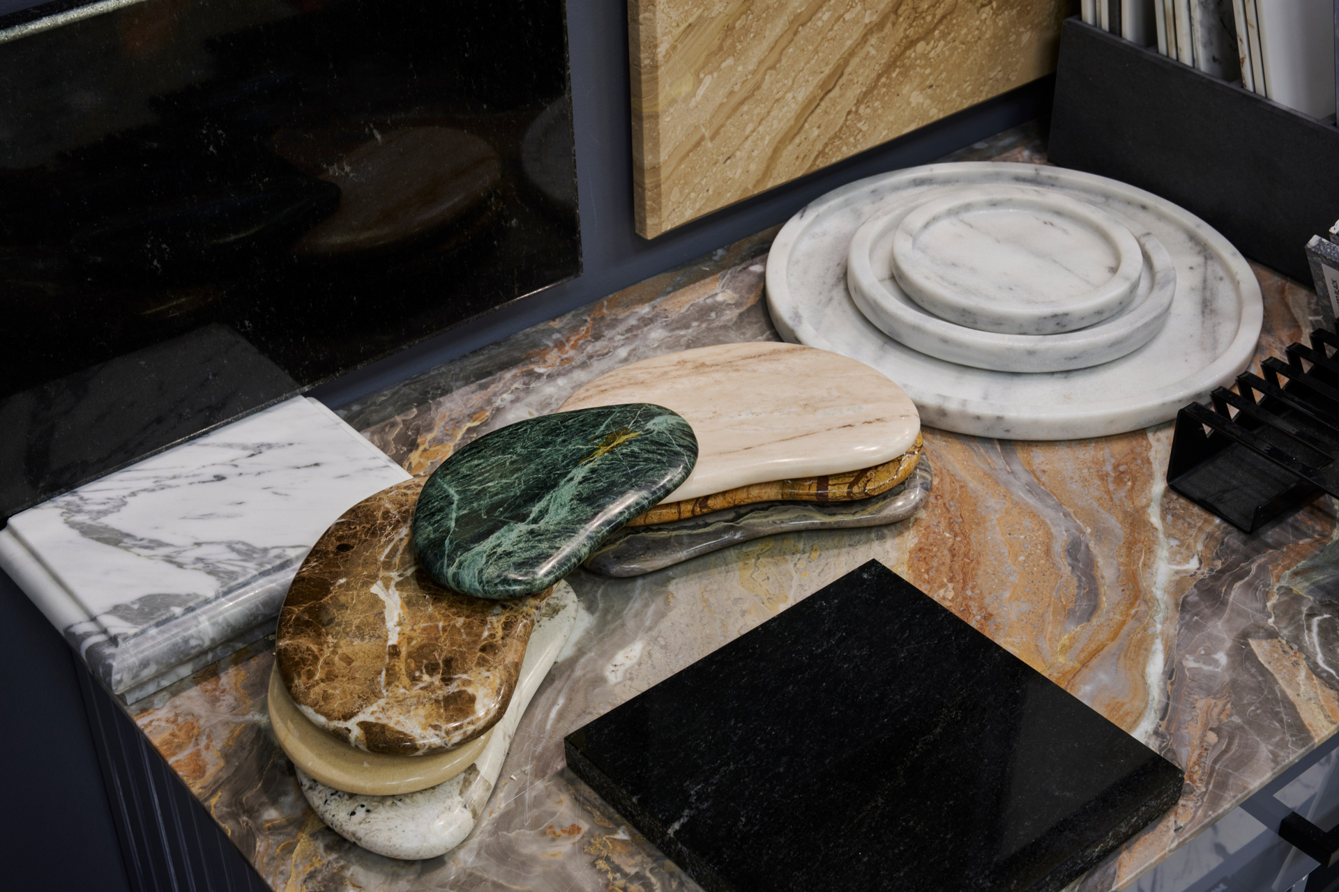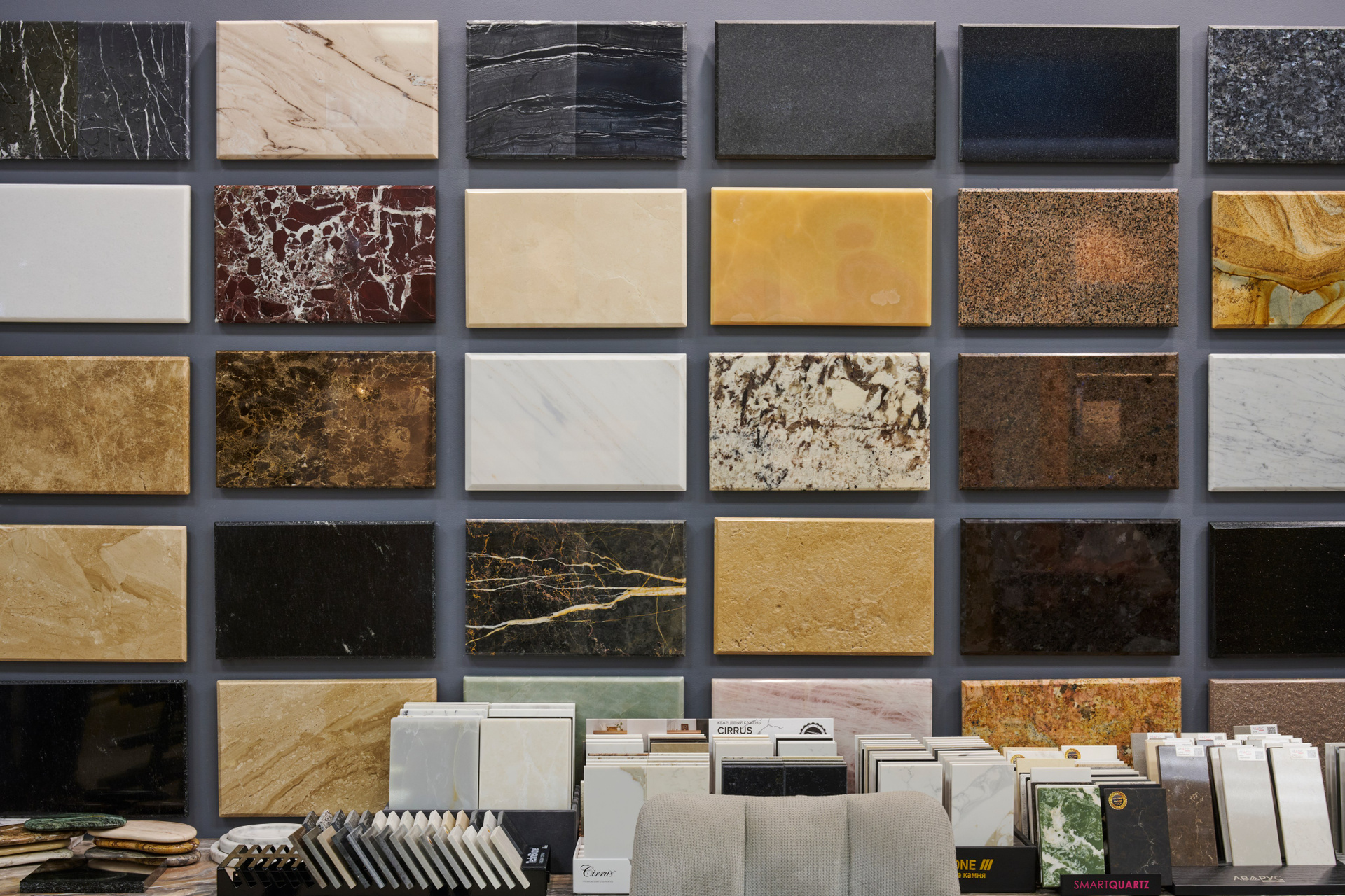 — шоурум в EXPOSTROY: стенды с образцами, зоны подбора, демонстрационные панели и «витринные» кадры материалов.