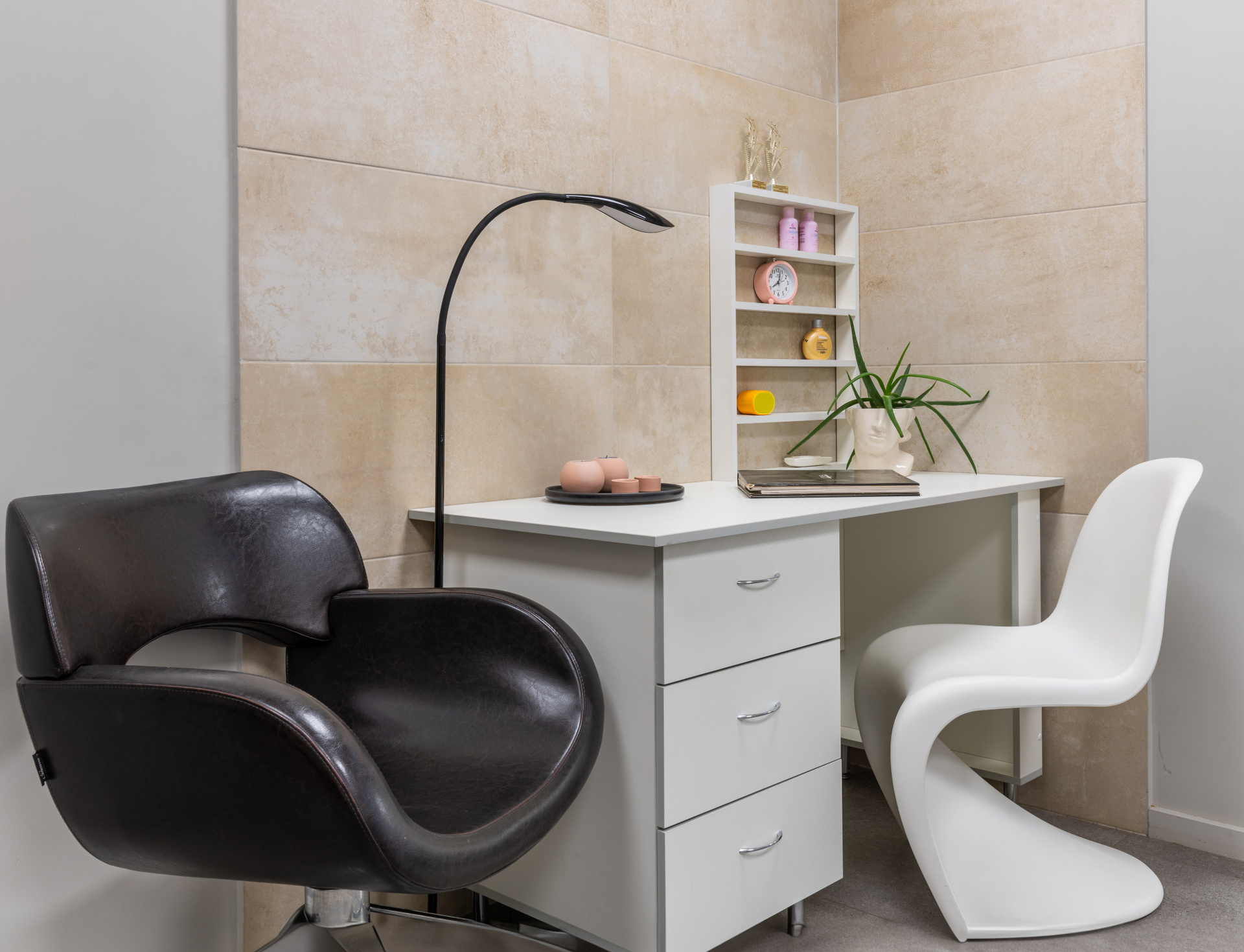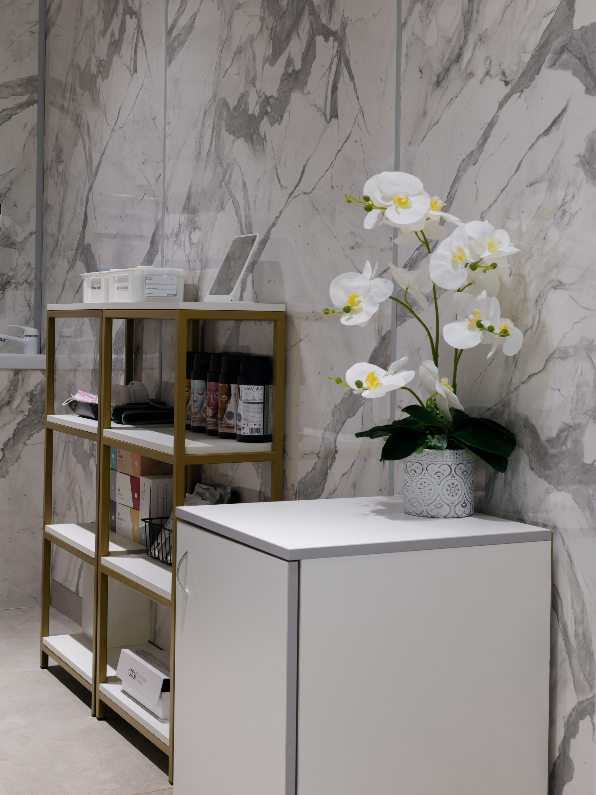 Салон красоты AprilBeauty: фасад и вход, рабочие места мастеров, витрины с косметикой, стойка администратора и зона...